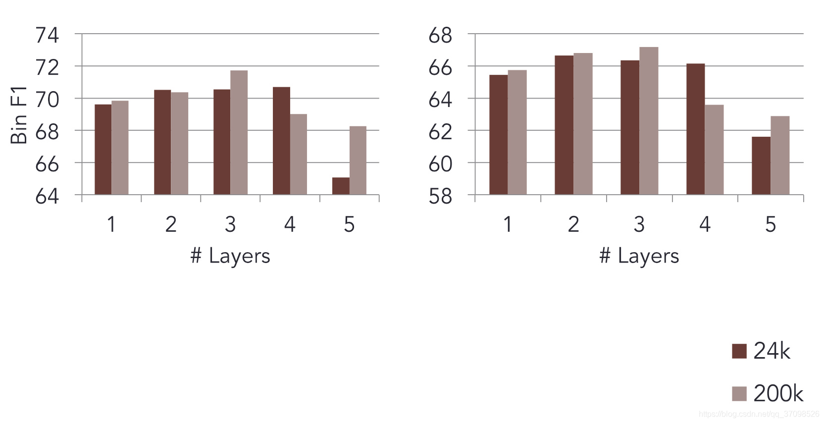 评测方法是标准的F1(因为标签样本不均衡),在不同规模的语料上试验不同层数的影响: