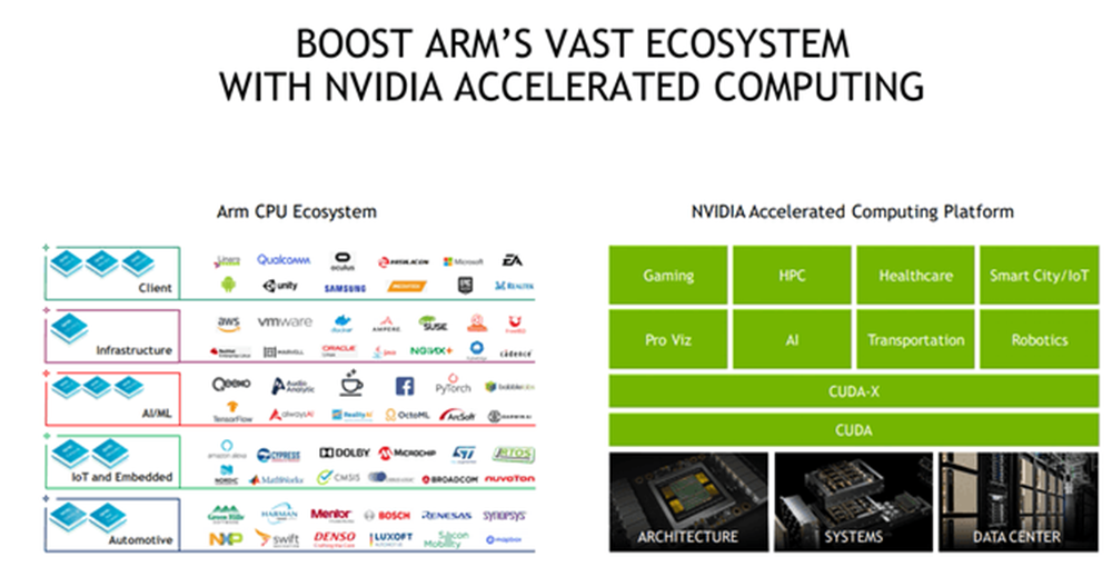 英伟达与ARM这种组合对公司、客户和整个行业都带来了好处。对于ARM的生态系统,该组合将增强ARM的研发能力,并利用英伟达全球领先的GPU和AI技术扩展其IP产品组合。