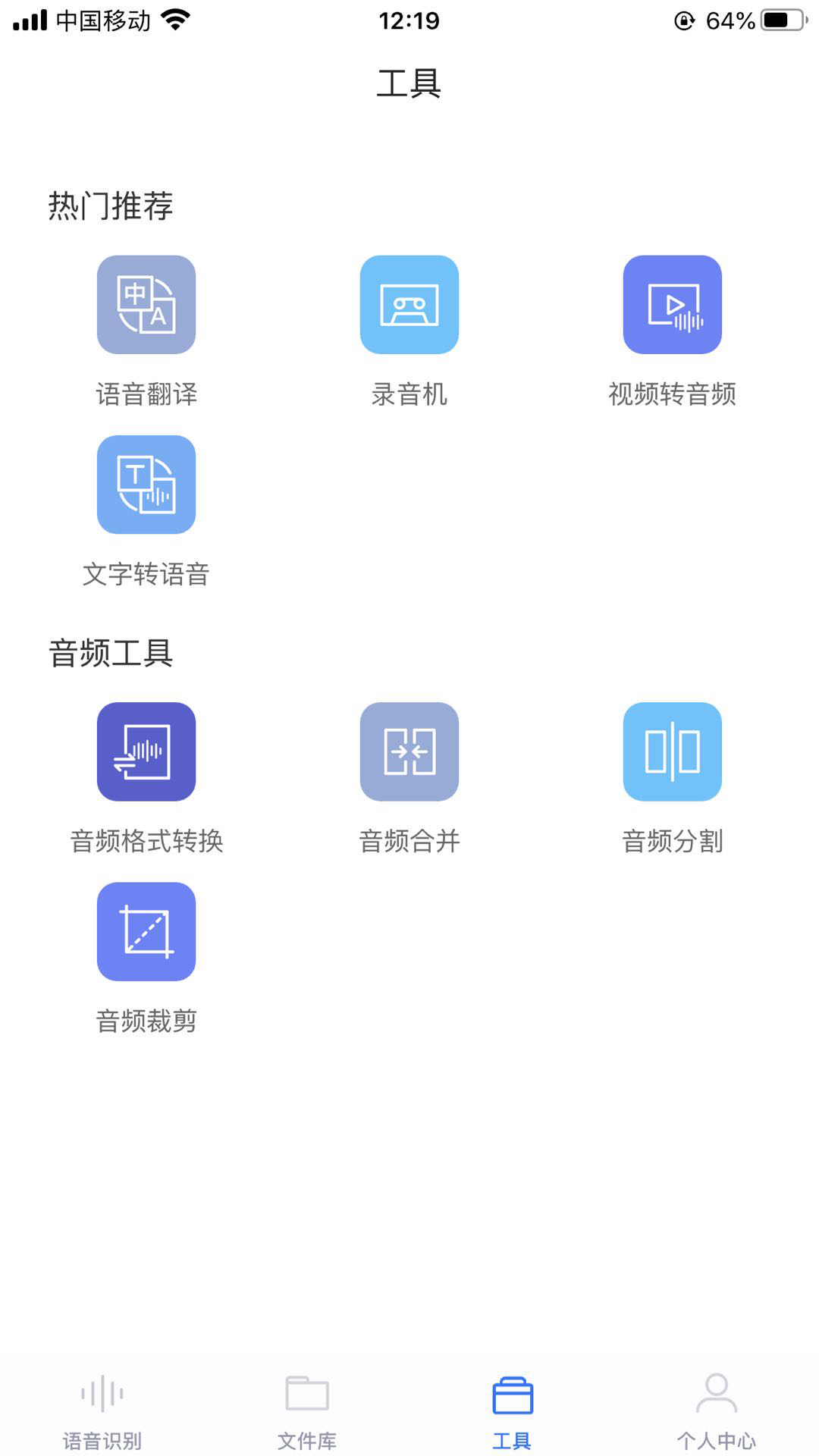 2、安装好以后打开该软件,软件下方有几个主要功能页面,语音识别,文件库,工具和个人中心。我们点击工具选项,进入到热门推荐功能页面,看到第一个功能语音翻译。