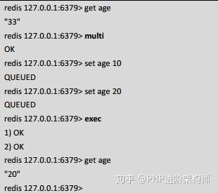 这个例子可以看到:两个set命令发出后并没有立即执行而是放到队列中,redis接受到exec命令才开始执行。