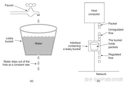 漏桶(Leaky Bucket)算法思路很简单,水(请求)先进入到漏桶里,漏桶以一定的速度出水(接口有响应速率),当水流入速度过大会直接溢出(访问频率超过接口响应速率),然后就拒绝请求,可以看出漏桶算法能强行限制数据的传输速率.示意图如下: