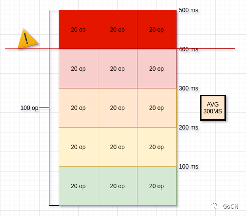 假设 如下图的一个瞬间, 系统 处理 100 条并发请求的 时耗如下左边所示, 这 100 条请求里面 时耗分为 五个段, 0 ~ 100 ms,101~200 ms,201 ~ 300 ms,301 ~ 400 ms,401 ~ 500 ms, 接着 很快就能算出 这一秒请求的时耗 平均值 是 300 ms, 在 3s 或者更长的时间段里, 我们都能看到时间段内的所有请求的平均值 在 300ms.