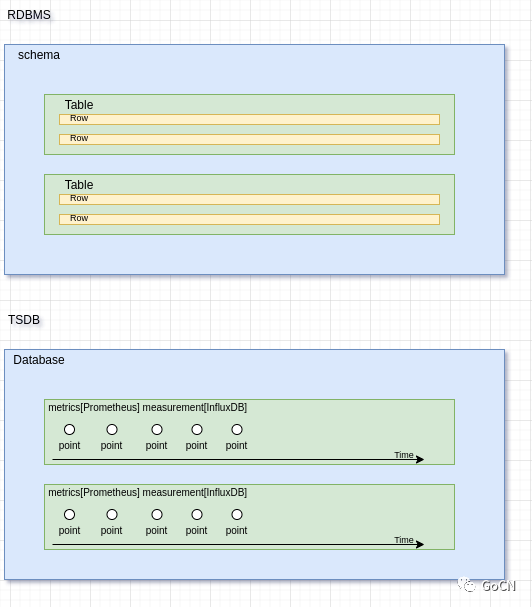 Database对应 RDBMS 的 Schema , 概念类似 , 而在 Prometheus 中则没有 这一层, 所有的 Metrics 都在一个 Database 中Metrics对应 RDBMS 的 Table , 在 InfluxDB 中这一层叫做measurement,概念类似 .Point对应 RDBMS 的 一条数据 Row , 这个是 TSDB 中的最小单位, 每个 Point 带有一些 Tag , 可以根据不同的条件筛选出来