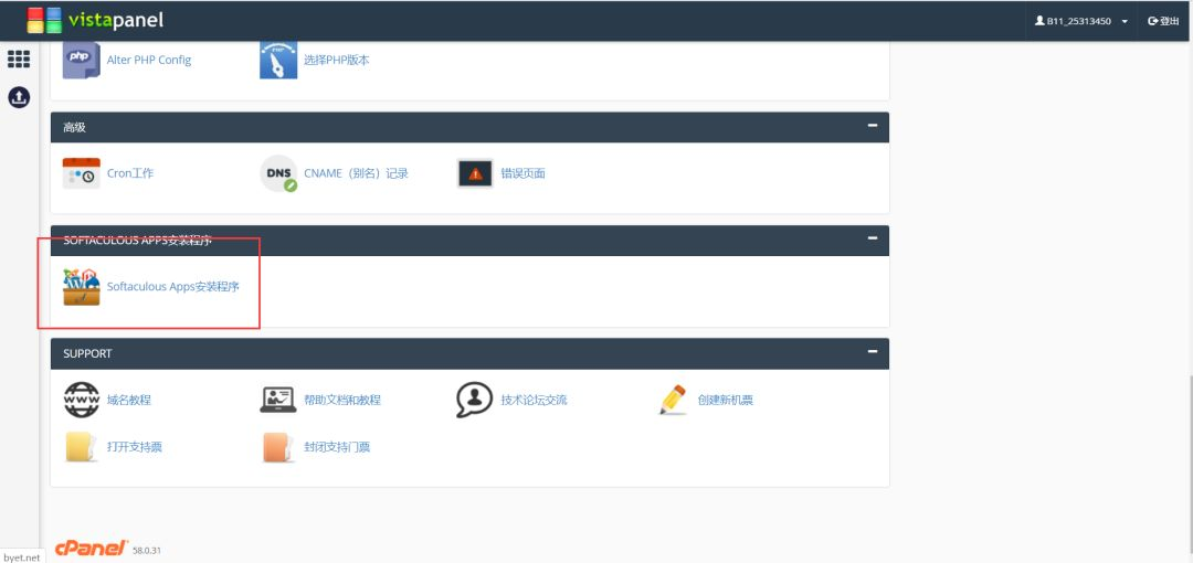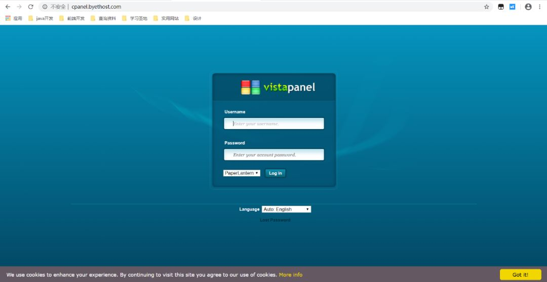 接下来访问cPanel 中的地址(邮件中也把链接放上去了,复制到浏览器即可),登录名和密码都在邮件中,注意是cPanel 的账号和密码。在最下方可以设置控制面板的语言。