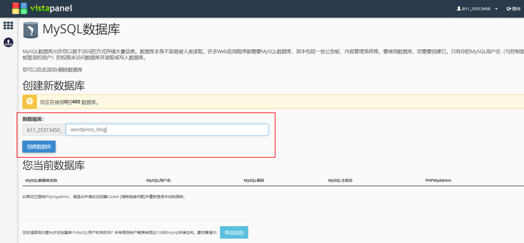 输入一个数据库的名字,我打算以后放wordpress(结果被墙了,于是换了zblog),所以先起这个名字吧。