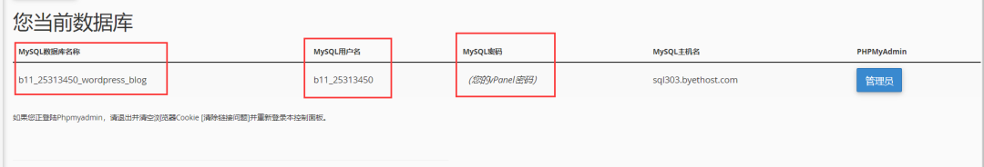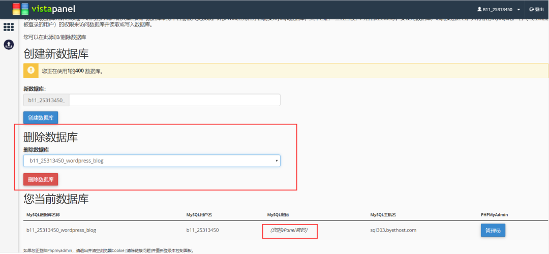 然后我们看到数据库已经建立好啦,密码啥的都在邮件里面,大家一定记住啦