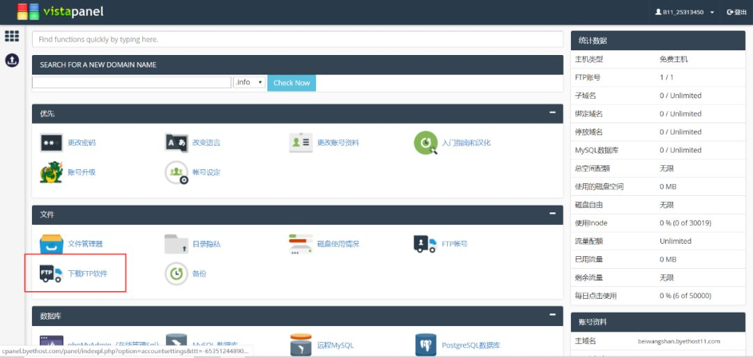 Byethost提供5500M 免费PHP空间 ,采用VistaPanel 管理面板。支持PHP5,FTP、WEB方式上传管理文件,每月200G流量,可以免费创建50个MySQL数据库,可以创建50个子网站,还可以绑定50个域名。还提供1个10M支持POP3、IMAP的免费邮箱。