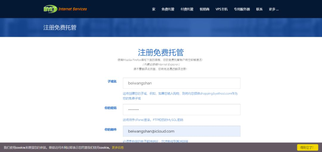 byethost.com是一个老牌的免费空间商,从2006年起就开始提供免费空间了,其免费服务非常稳定。申请过程非常简单,只是必须使用FireFox浏览器才能申请。申请后,Byethost 会将详细资料发送到你注册的邮箱。包括控制面板、FTP和MYsql 。