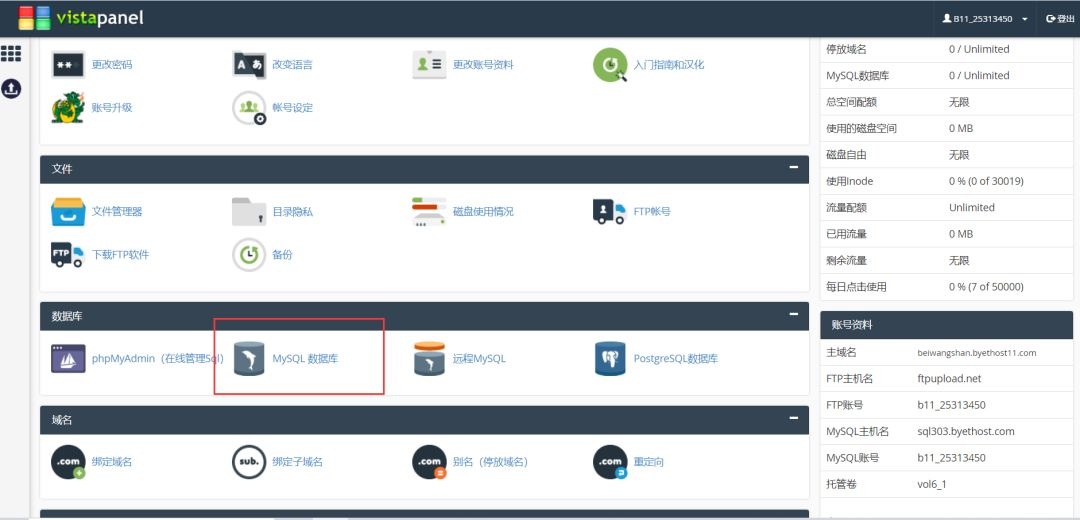 等待文件都上传完之后,打开控制面板,新建数据库。