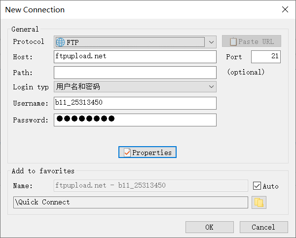 大家按照我下面的截图填就可以,Protocol,填写邮件中的FTP Server的地址,用户名和密码填写FTP的用户名和密码即可。