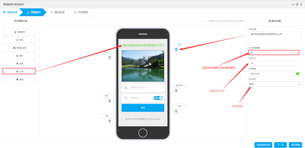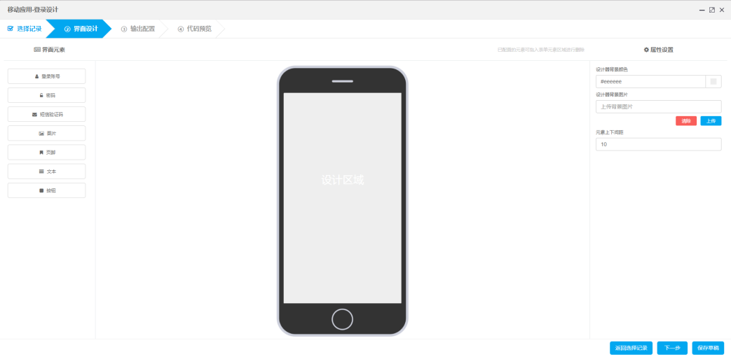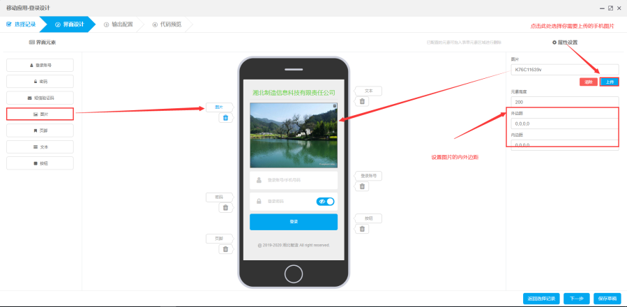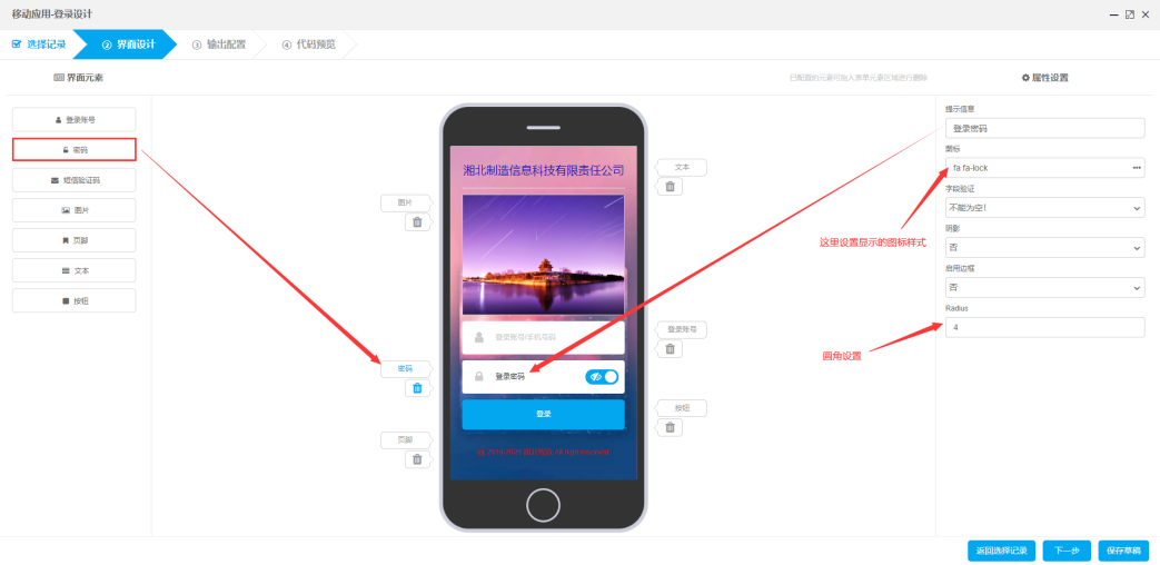 得益于出色的可视化操作模式,我们仅需点击”手机开发”——“移动应用设计”——“设置登录界面元素”就可以设置登录界面
