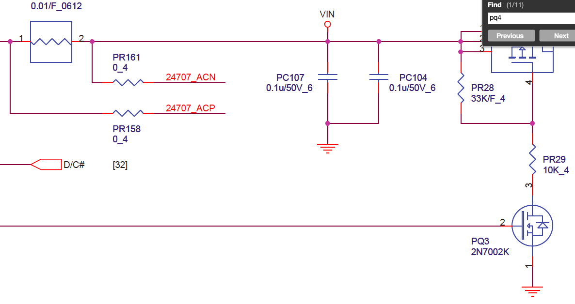 装机后发现单电池可开机,适配器也可开机,但是同时用时电流5A大短。检测放电管正常,放电管G级由EC发出的D/C#控制,检测装上电池后不管插不插适配器,此信号都为高,正常插适配器时此信号为低,单电池时才为高。接着检测ACIN由充电IC发出,发现此信号也是装上电池后,不管插不插适配器都为低。正常插适配器此信号为高,单电池时才为低。而ACIN是由充电IC控制一颗小MOS(PQ4)管G级实现高低信号切换,将此管拆掉后ACIN信号始终为高(因为没有了PQ4的切换,所以一直为高),测量PQ4的G极,接电池时为高导通(这样就拉低ACIN),插适配器时为低结止(这样ACIN就为高),信号切换正常了,本以为就是PQ4坏导致,更换一颗上去,还是那样G极一直为高拉低ACIN,一直没搞明白就暂时将PQ4拆了用。充电放电都正常,只不过ACIN始终为高。