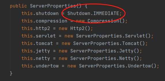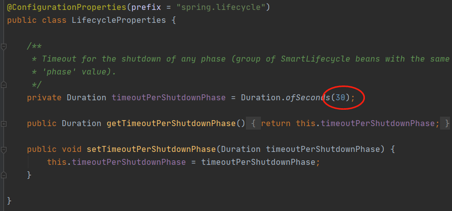 上面介绍了优雅关闭参数的配置方式,下面我们通过源码来看下默认的配置是什么。