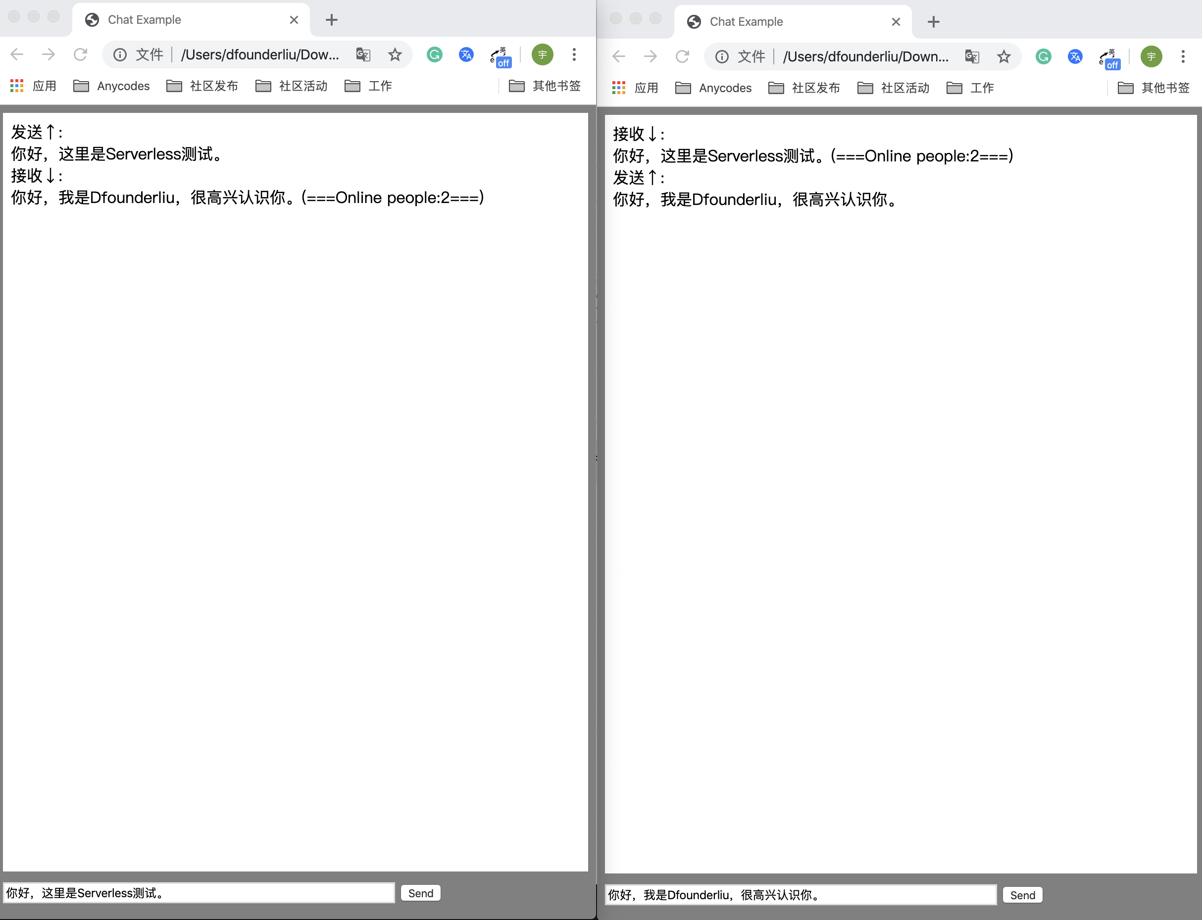 完成之后,我们打开两个页面,进行测试: