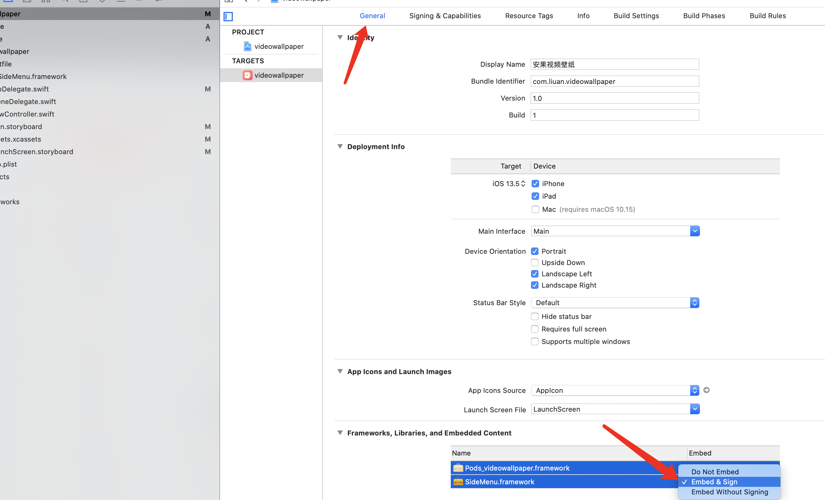 - 打开项目,点击project,选择target, 再选择上方的General,将需要的framework文件拖到 Embedded Binaries(动态库)内