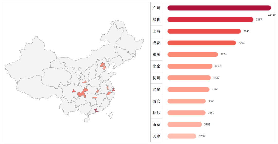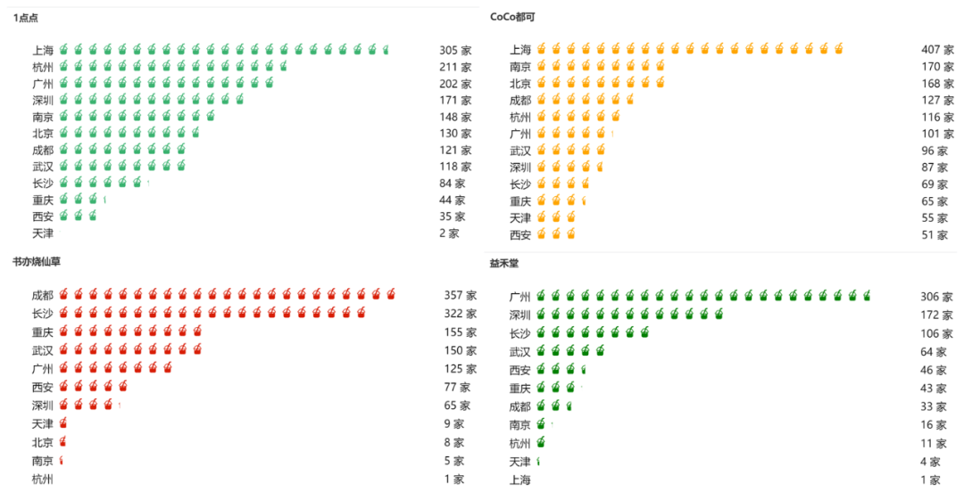 接下来介绍一下大众奶茶中的1点点,CoCo,书亦烧仙草和益禾堂的热门城市分布情况,因为笔者在广州经常能看到这几家店,而且店面都是挨得很近。1点点和CoCo在上海的分店数量都是最多的,而书亦烧仙草在成都和长沙比较普遍,益禾堂则是在广州和深圳。这4家奶茶品牌在广州分店数量均有上百家,也难怪走到哪都能看到这几家奶茶店。