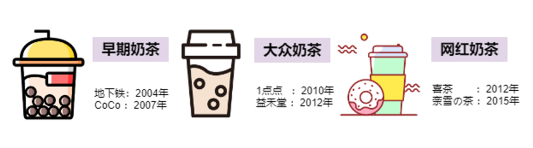 奶茶起源于中国北方游牧民族,知名于中国台湾。早期的台湾奶茶品牌,如CoCo、50岚、老虎茶等等。前两家CoCo和50岚(现在的1点点)都已经成为中国大陆大型的连锁奶茶店。随着奶茶越来越受大众喜爱,涌现出更多的本土奶茶品牌,如蜜雪冰城、益禾堂。再到如今的网红时代,由于不同奶茶品牌的口味差异不大,如何更好地营销自己的奶茶品牌,让消费者能从众多奶茶中翻到自己的牌子,变得更加重要。例如奈雪的茶主打高端路线,奶茶均价在40元左右;喜茶主打品牌差异化,注重茶饮口感的同时营造店面排长龙的“时尚文化”。
