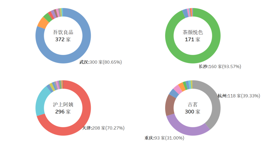 有些奶茶店很有自己的地域特色,如果你想品尝它们的原版奶茶,就可能需要跑到别的城市才能喝到,因为它们大部分分店都只开在本土城市。例如“吾饮良品(I Drink)”大部分分店开设在武汉。“茶颜悦色”的店面93.57%在长沙。“沪上阿姨”虽然生在上海,却火在天津,分店总数有208家,而上海只有6家分店。“古茗”的分店主要集中在杭州和重庆,“茗”象征着茶,因为这2个城市是盛产茶叶的地方。如果大家到了这些城市,记得打卡喝一杯原汁原味的奶茶。