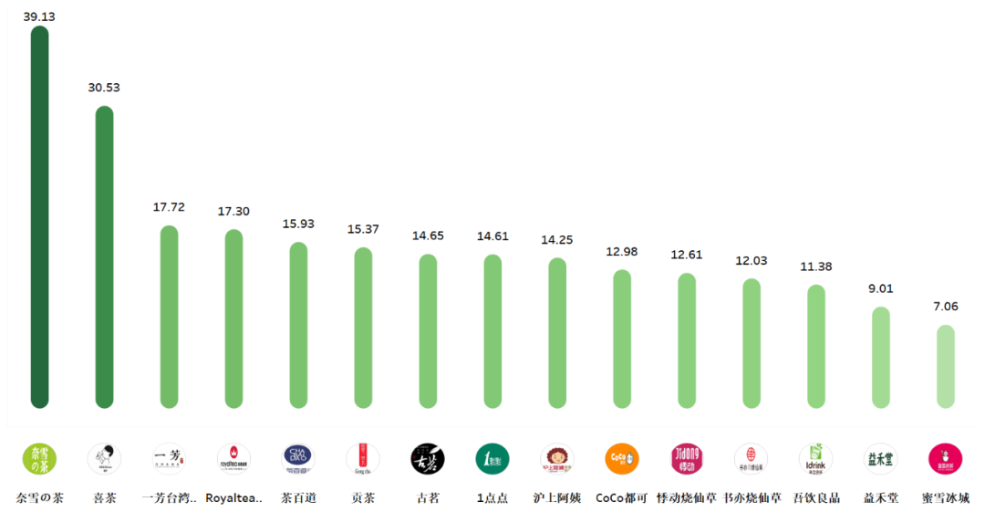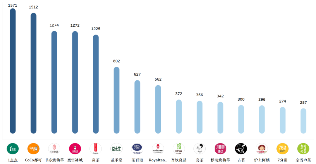 在这12个热门城市中,总共有3万多个奶茶品牌,最为消费者所熟悉的奶茶品牌有1点点和CoCo,它们都拥有超过1500家门店,并且都是存活了10多年的老品牌。此外,书亦烧仙草、蜜雪冰城和贡茶这些也都是有上千家门店的奶茶品牌,它们的门店都喜欢开在一起,类似于麦当劳和肯德基。一旦你在某个城市商圈看到其中一家奶茶店,在几百米的距离内肯定能找到上述的某几家奶茶店。