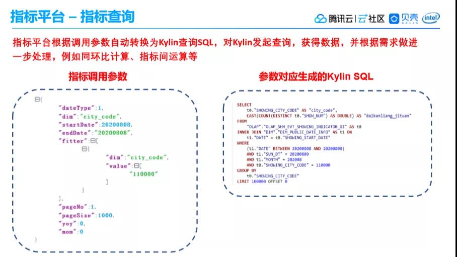 指标的第一个功能是统一的口径管理,第二是指标的查询,业务人员可以通过指标调用参数对指标的不同维度进行过滤。比如起始日期,指标平台根据调用参数自动转换成 Kylin 查询 SQL,对 Kylin 发起查询获得数据,并根据需求作进一步处理,例如同环比计算、指标间运算等。