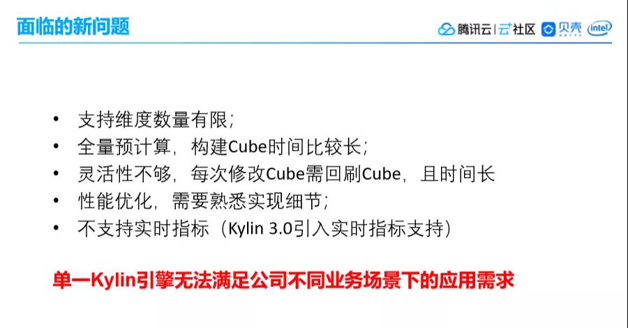 首先是能力方面的问题,底层基于 Kylin 的预计算原理导致维度多、基数高,Kylin 的计算量就会指数型膨胀,它支持维度并不能太多,官方最多是80个,实际上20个以上就要深度优化了,支持维度也有限,我们的业务里面很多指标也有需要有三四十个维度,集团带看量就有20个维度。
