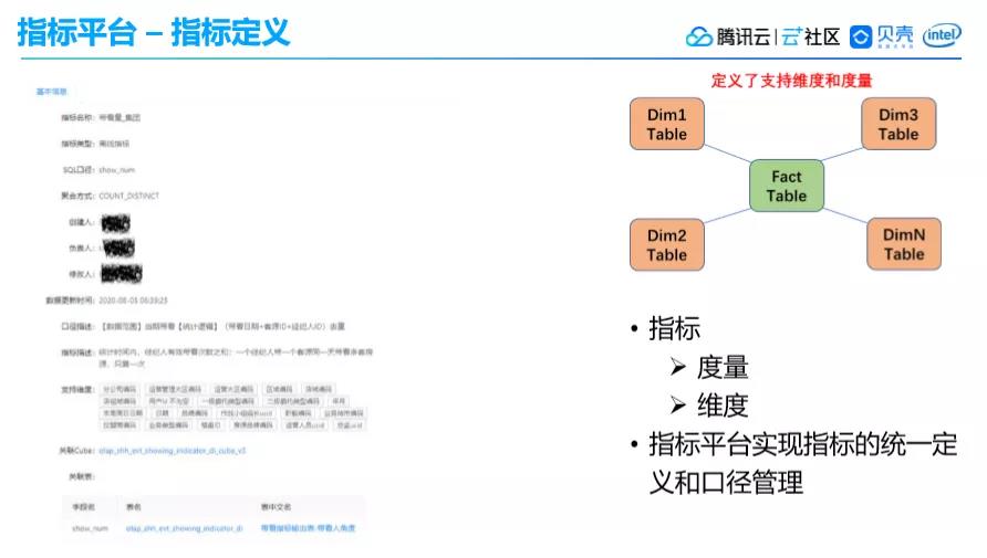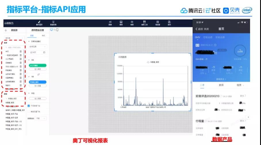 指标平台的第三个功能是指标 API 应用,通过指标 API 对外暴露指标。指标API上层应用能够通过指标API来调用指标,比如公司的可视化平台,可以在里面配一个报表,可能很多公司也有这方面的可视化的工具,比如腾讯云也有可视化分析的工具。