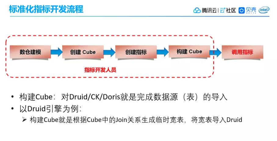 这种架构引擎下,标准化开发流程的步骤没有太大差别,还是数仓建模、创建 Cube、创建指标、构建 Cube、调用指标,但是所有动作都是在指标平台上完成。但是很多动作语义发生了变化,构建 Cube 是对 Druid/CK/Doris 完成数据的导入。