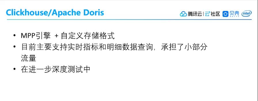 CK 和 Doris 就不过多介绍了,都是基于 MPP 的,有自定义的存储格式。目前主要用于实时指标和明细数据查询,承担了小部分流量,在 1%-2% 左右,现在还在进一步深度测试中。