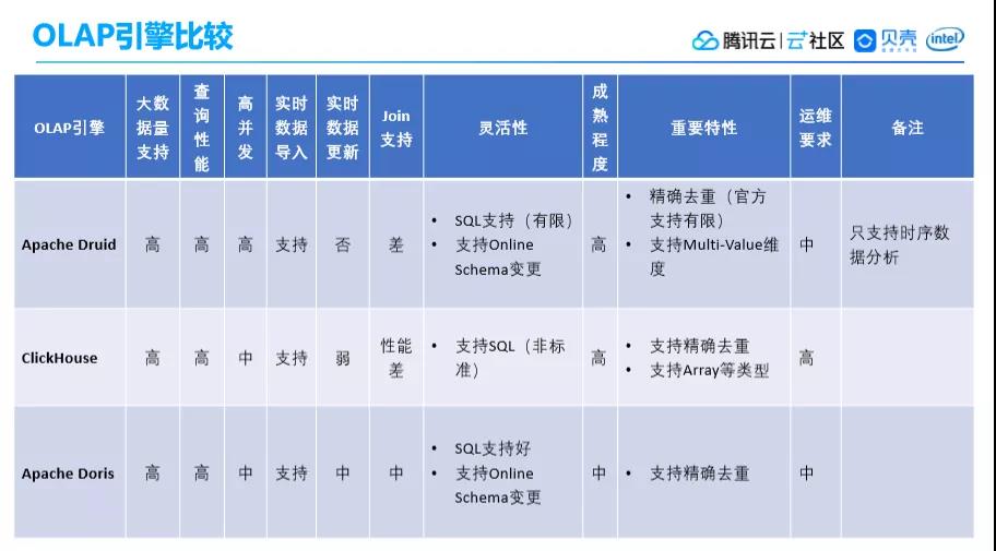 我们首先关注的是数据支持量和查询性能,这几个数据都是不错的,可以满足公司 TB 级的需求,并发量相对高,其他关注的几个是实时数据导入和更新等等,目前 Doris 支持的比较好一点,ClickHouse虽然也支持实时更新,但比较弱。