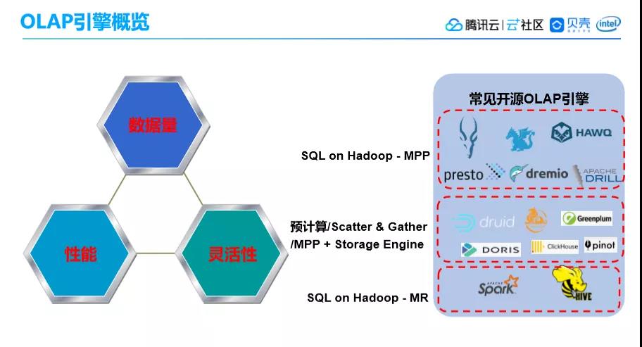 OLAP 引擎大概可以分为三类,首先是 SQL on Hadoop,特点是数据量大、容错性好、灵活性高,有完备的 SQL 语句支持,但性能上要达到亚秒级响应是比较困难的。