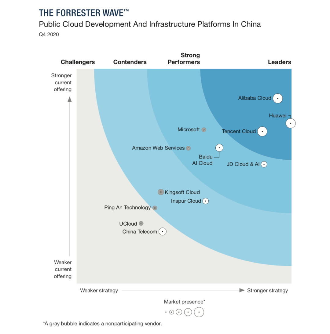10月19日,国际权威分析机构Forrester发布了《The Forrester Wave™:公有云开发与基础架构平台中国市场厂商评测》报告,2020年中国公有云开发与基础架构平台厂商领导者和卓越表现者象限仅有7家公司——国际公司AWS、MS以及国内的BAT、华为、京东。