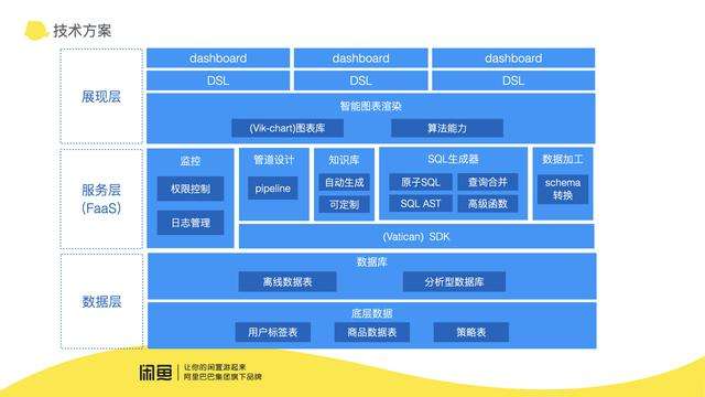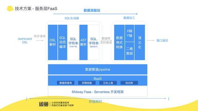 整体逻辑是展现层会上报 DSL(一个结构化的描述)到 FaaS 层,FaaS 层会经过一层 SQL 拼装、生成的逻辑,把最终的 SQL 放到数据层去做查询,数据层把查询到的结果返回到 FaaS 层,FaaS层 再经过数据加工把数据回传给前台做可视化展现。