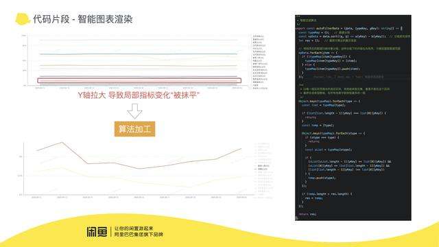 这里是一个更加直观的示例图。画红线的部分是下面放大的部分。如果只看上面那张图,其实看不出任何有价值的信息。因为 Y 轴被拉大了,导致局部的指标变化被抹平,直接看的话会认为这些指标没有任何波动。对业务来说,它需要关注的是波动、突变的部分。如果把这些信息在可视化的时候抹平了,用户发现问题的窗户其实基本上被你关闭了。这里面智能渲染做的事情,是通过算法加工的逻辑做显著性提取,把波动明显的、对业务有参考价值的数据优先展现出来,其他选择性地弱化处理。右边是实现的代码片段,整体的实现逻辑是去遍历递归所有的 X 轴 Y 轴,检查有交集的部分以及 Y 轴波动区间范围。