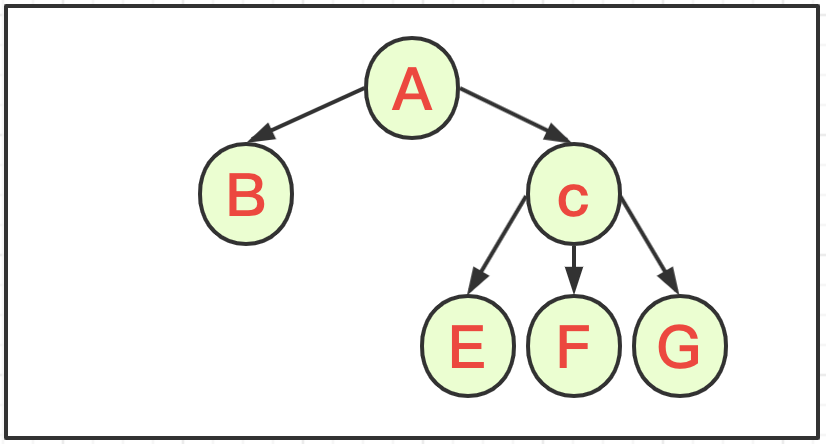 - 根节点:树的根源,没有父节点的节点,如上图A节点;