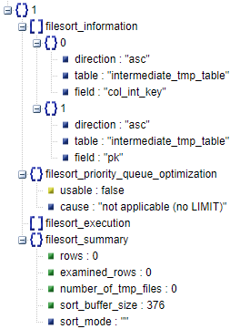 * eq_ref_to_preceding_items:与前置表关联的是否是唯一索引。在这个示例中,并没有这样的情况所以没有列出。如果语句稍微改写一下,将原始查询语句改写为“t1 STRAIGHT_JOIN t2”,让t1去驱动t2表,就发现在分析items[1].item = t2.pk时出现了该字段。这是由于t1与t2通过t2的主键pk列进行关联,这就意味着,t1中的一行数据最多只能在t2中关联出一列,所以在后续优化的结果语句中order by 的t2.pk列被优化掉了,因为这一列已经确认唯一不需要再进行排序。