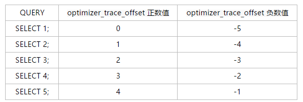 * optimizer_trace_offset 的正负值,不需要太过于去纠结,如下表所示,其实offset 0 = offset -5 ,它们是一个等价的关系,仅仅是表述方式不同。这样的表述方式和python中的切片的表述是一致的,了解python的童鞋们都知道,切片的时候经常用到-1取列表中最后一个数值或者是反向取值。