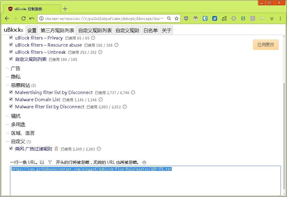 确保只开启一个规则订阅就可以了,太多规则会拖累浏览器响应速度,当然你可以和其他规则订阅切换着用,比较一下效果