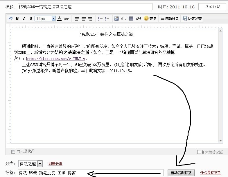 - 然后取其前TOP K,如上面截图中的“算法”在那篇文章中出现了4次,“博客”出现了3次,所以系统为你自动匹配这些标签。