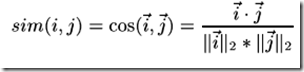 两个项目 i ,j 视作为两个m维用户空间向量,相似度计算通过计算两个向量的余弦夹角,那么,对于m*n的评分矩阵,i ,j 的相似度sim( i , j ) 计算公式:(其中 " · "记做两个向量的内积)