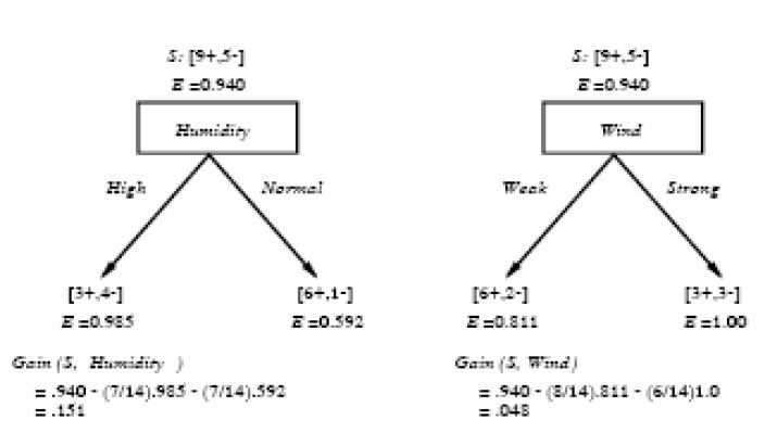 在上图中,计算了两个不同属性:湿度(humidity)和风力(wind)的信息增益,最终humidity这种分类的信息增益0.151>wind增益的0.048。说白了,就是在星期六上午是否适合打网球的问题诀策中,采取humidity较wind作为分类属性更佳,决策树由此而来。