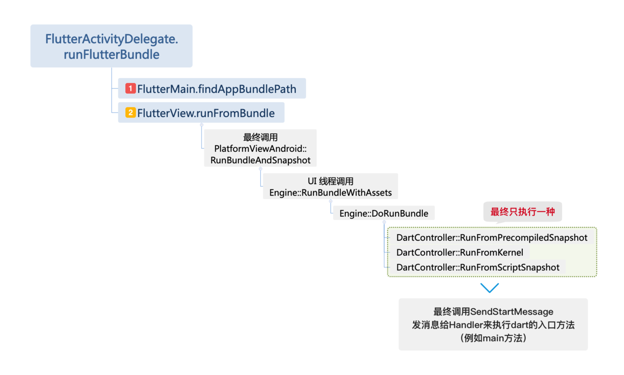 Flutter Bundle的初始化是由调用FlutterActivityDelegate.runFlutterBundle开始的,先用一张图来说明下runFlutterBundle方法的调用栈: