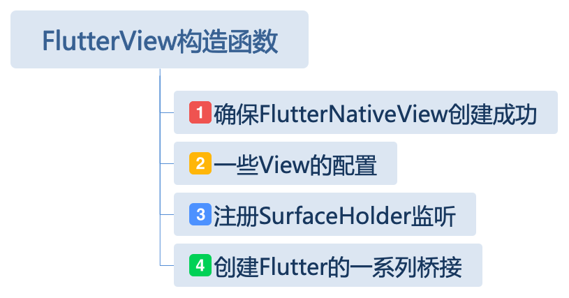 FlutterView的初始化就是纯粹的Android层啦,所以相对比较简单。分析FlutterView.java的构造函数就会发现,整个FlutterView的初始化在确保FlutterNativeView的创建成功和一些必要的view设置之外,主要做了两件事: