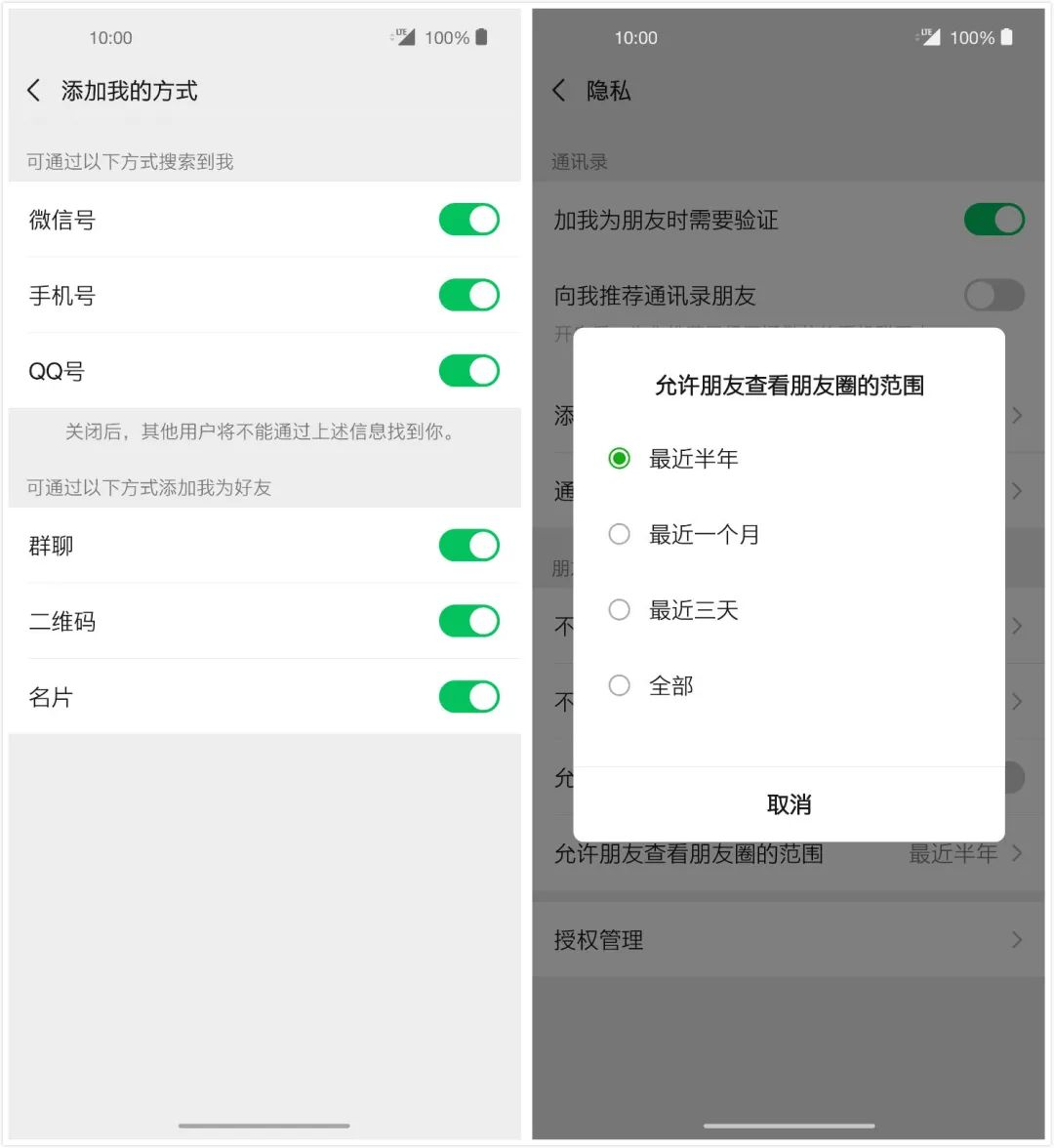 当然这些担心都是建立在「微信被封号」这样一个极端情况下。加好友的过程需要双向验证,不是保存一个电话号码那么简单,所以重新建立这种联系会很困难。但其实这些功能本身就应该赋予给用户,虽然是微信的熟人关系链泛化之后「不得已而为之」。三天可见朋友圈、朋友圈分组、黑名单,还有最近加好友时的「仅聊天」选项、对添加方式的限制,都是在解决这种复杂但又无法摆脱的境况。