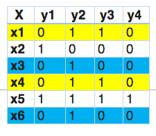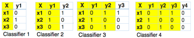在分类器链中,这个问题将被转换成4个不同的标签问题,就像下面所示。黄色部分是输入空间,白色部分代表目标变量。