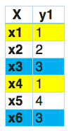 在这一点上,我们发现x1和x4有相同的标签。同样的,x3和x6有相同的标签。因此,标签powerset将这个问题转换为一个单一的多类问题,如下所示。