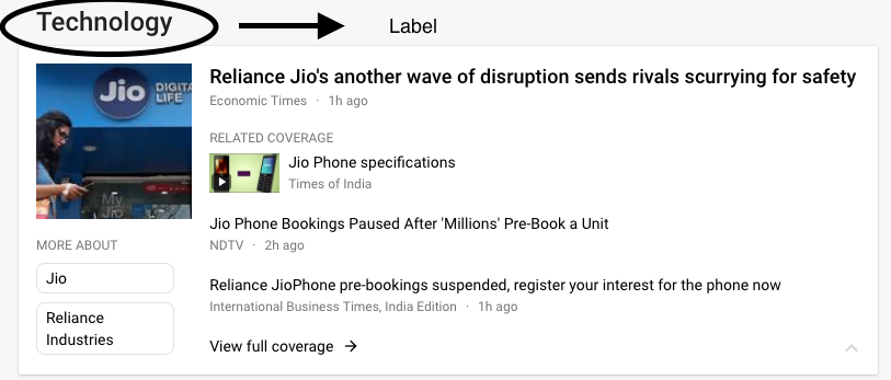 谷歌新闻所做的是,将每条新闻都标记为一个或多个类别,这样它就会显示在不同的类别之下。