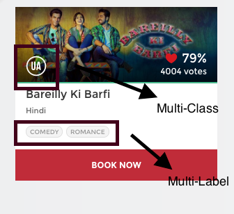 对于任何一部电影,电影的中央委员会会根据电影的内容颁发证书。例如,如果你看上面的图片,这部电影被评为“UA”(意思是“12岁以下儿童需在父母陪同下观看”)。还有其他类型的证书类,如“A”(仅限于成人)或“U”(不受限制的公开放映),但可以肯定的是,每部电影只能在这三种类型的证书中进行分类。简而言之,有多个类别,但每个实例只分配一个,因此这些问题被称为多类分类问题。