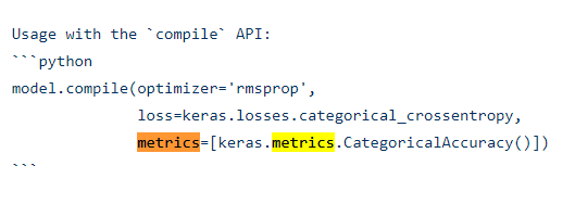 metrics["accuracy"] : == categorical_accuracy; 最快的验证方法,训练一个简单网络,同时输出默认accuracy,categorical_accuracy,,binaray_accuracy, 对比就可以知道;