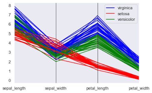 另一个很酷的可视化工具是 parallel coordinate plot,它将每一行表示为一条直线。