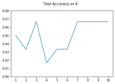 我们可以看到,当K为3或在7到10之间时,精确度最高(约为0.965)。与以前的模型相比,分类新的数据点不那么直接,因为我们需要在四维空间中观察它的K个最近的邻居。